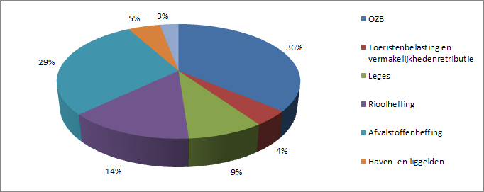 Het totaal aan belastingen en heffingen bedraagt € 6 miljoen. Onderstaande grafiek laat de verdeling van de opbrengsten uit de belastingen en heffingen in 2018 zien.